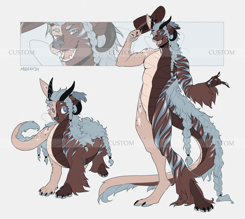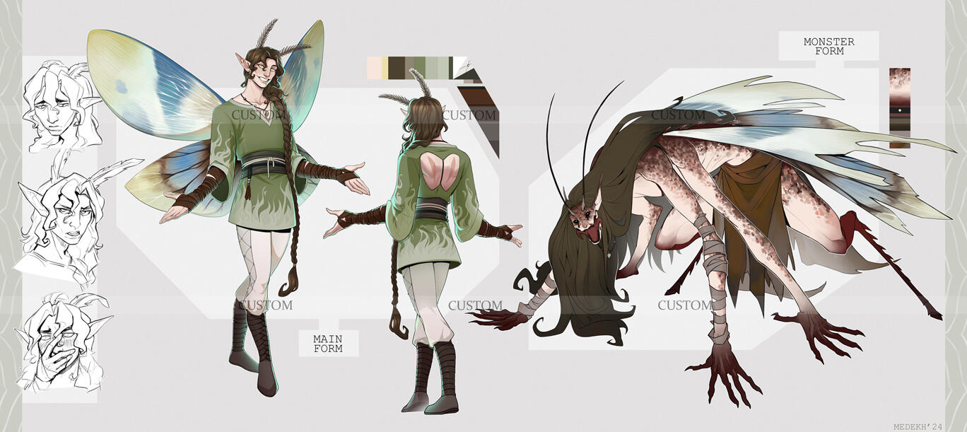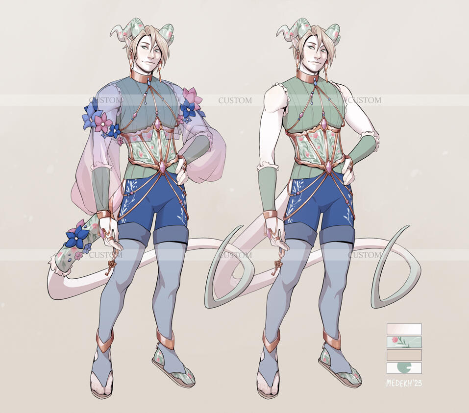 You provide a short description (can be overall theme, moodboard, species, class, masc/fem/nb, preferred pose, expression, clothing style, colors) and won't receive any WIPs till the end. This type of custom is detailed, includes 1 fullbody, palette, and might come with a small add-on (pet/item/close-up).Reach out to me with your idea or budget and I'll help find you the best option!